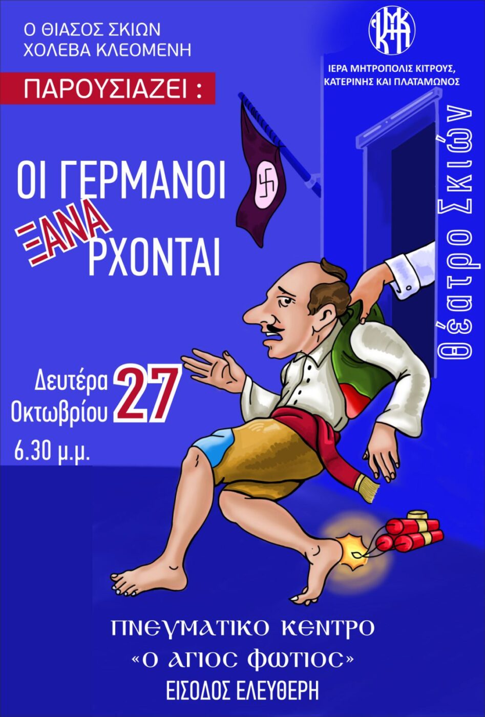Η Ιερά Μητρόπολη Κίτρους, Κατερίνης και Πλαταμώνος παρουσιάζει τη μοναδική παράσταση του Θεάτρου Σκιών «ΟΙ ΓΕΡΜΑΝΟΙ ΞΑΝΑΡΧΟΝΤΑΙ» από τον Θίασο του Κλεομένη Χολέβα.