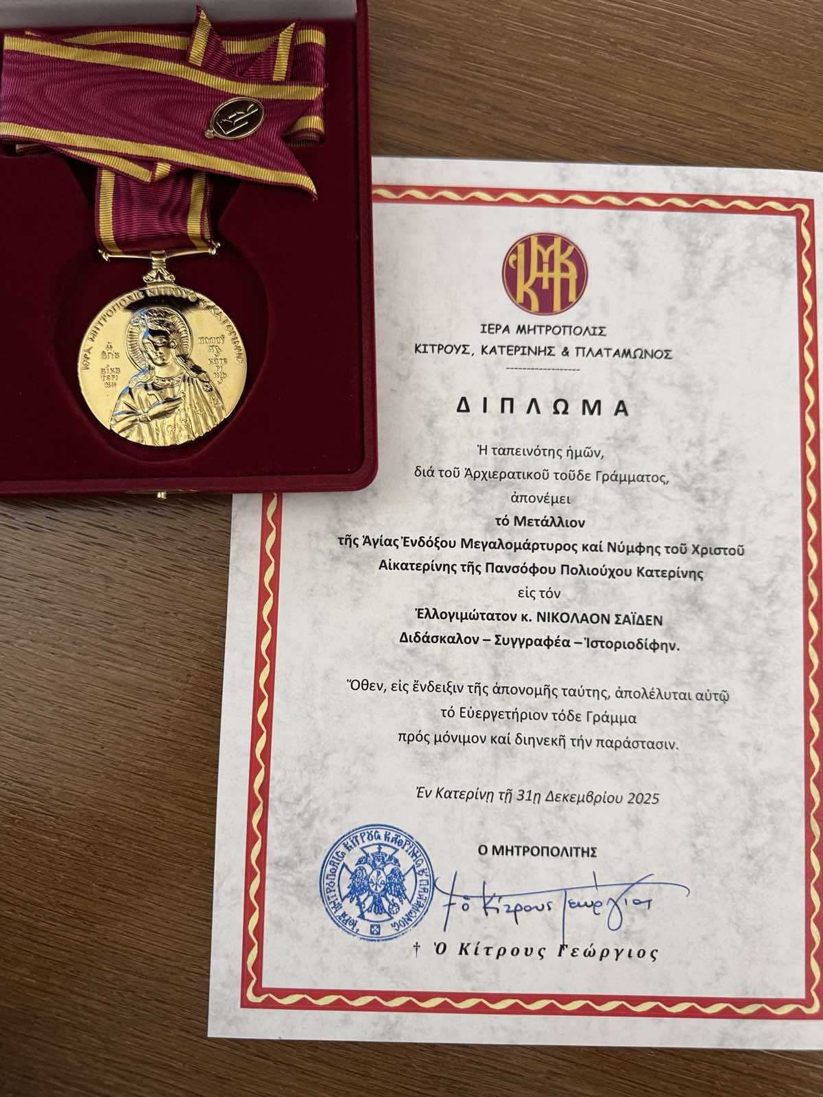Την παραμονή Πρωτοχρονιάς ο Σεβασμιώτατος Μητροπολίτης Κατερίνης, Κίτρους και Πλαταμώνος κ. Γεώργιος προέβη στην τιμητική βράβευση του διακεκριμένου εκαιδευτικού, συγγραφέα και ιστορικού Νικολάου Σαϊδέ, αναγνωρίζοντας τη μακρόχρονη και πολύτιμη προσφορά του στην ιστορική έρευνα και στα γράμματα.