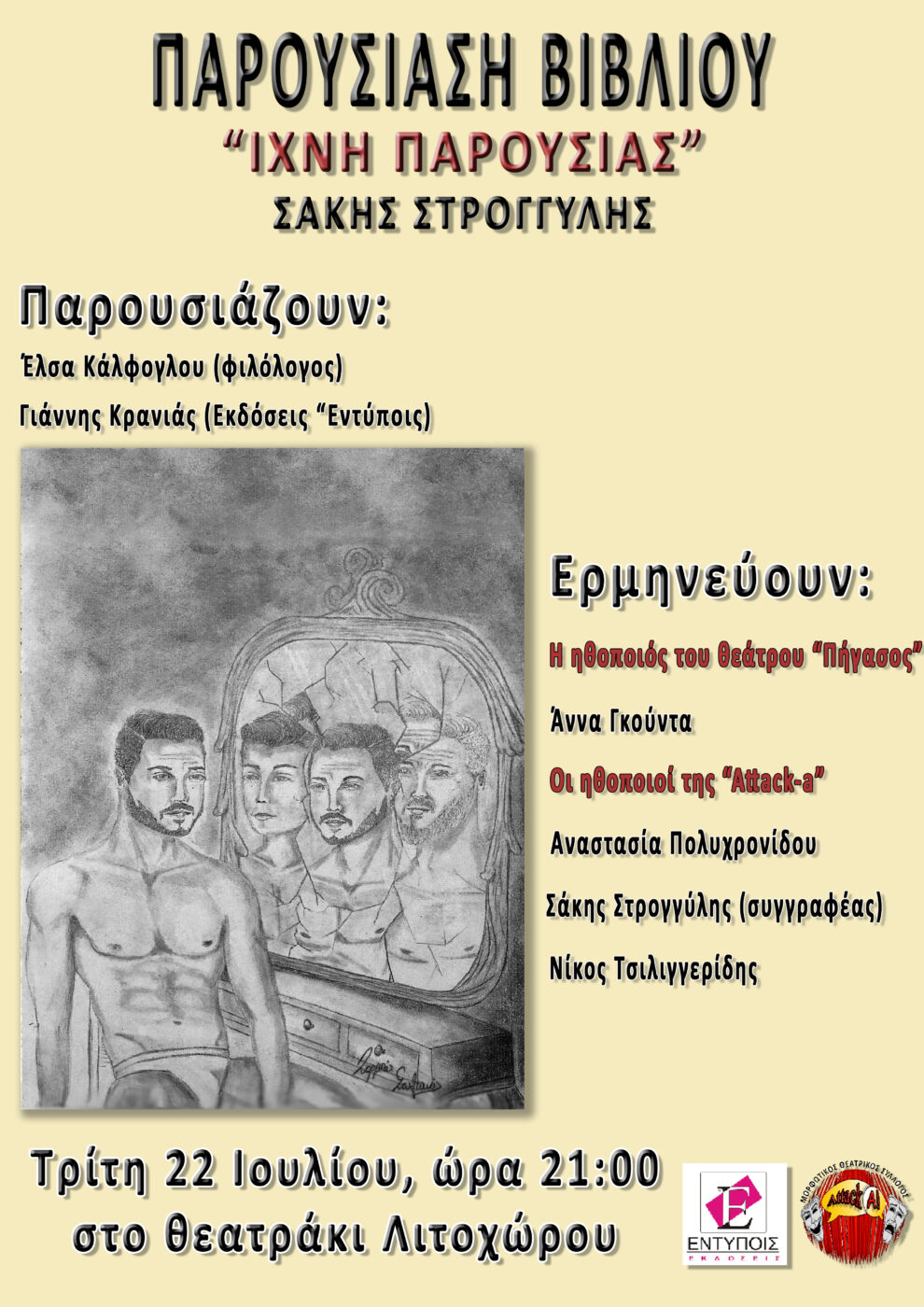 Πρόκειται για τη δραματοποιημένη παρουσίαση του βιβλίου «ΊΧΝΗ ΠΑΡΟΥΣΙΑΣ» που υπογράφει ο βραβευμένος ποιητήςκαι θεατρικός συγγραφέας από το Λιτόχωρο Πιερίας, Σάκης Στρογγύλης και κυκλοφορεί στα βιβλιοπωλεία από τις εκδόσεις «Εντύποις».