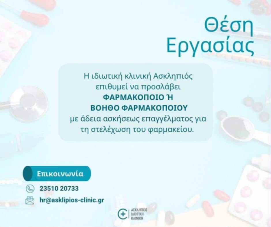 Η ιδιωτική κλινική Ασκληπιός επιθυμεί να προσλάβει φαρμακοποιό ή βοηθό φαρμακοποιού