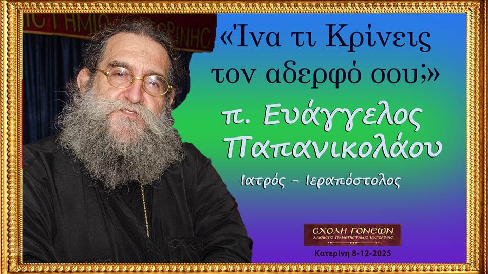 «Ίνα τι Κρίνεις τον αδερφό σου;» το θέμα της ομιλίας του πολυσέβαστου μας Ιατρού – Ιεραποστόλου π. Ευάγγελου Παπανικολάου την Δευτέρα 8 Δεκεμβρίου 2025 στίς 19:00 στην Σχολή Γονέων – Ανοικτό Πανεπιστήμιο Κατερίνης.