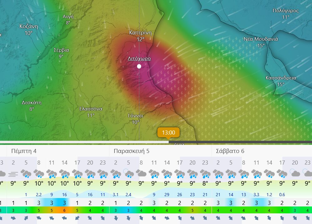 Η Παρασκευή αναμένεται να αποτελέσει την κορύφωση της κακοκαιρίας. Σημειώνονται εκτεταμένες και έντονες βροχές, με αυξημένο κίνδυνο για τοπικά προβλήματα, κυρίως σε περιοχές του Δήμου Δίου–Ολύμπου και νότια του Δήμου Κατερίνης. Οι εντάσεις των υετών προβλέπονται πολύ υψηλές για αρκετές ώρες, γεγονός που αυξάνει την πιθανότητα για πλημμυρικά φαινόμενα σε ευαίσθητα σημεία.