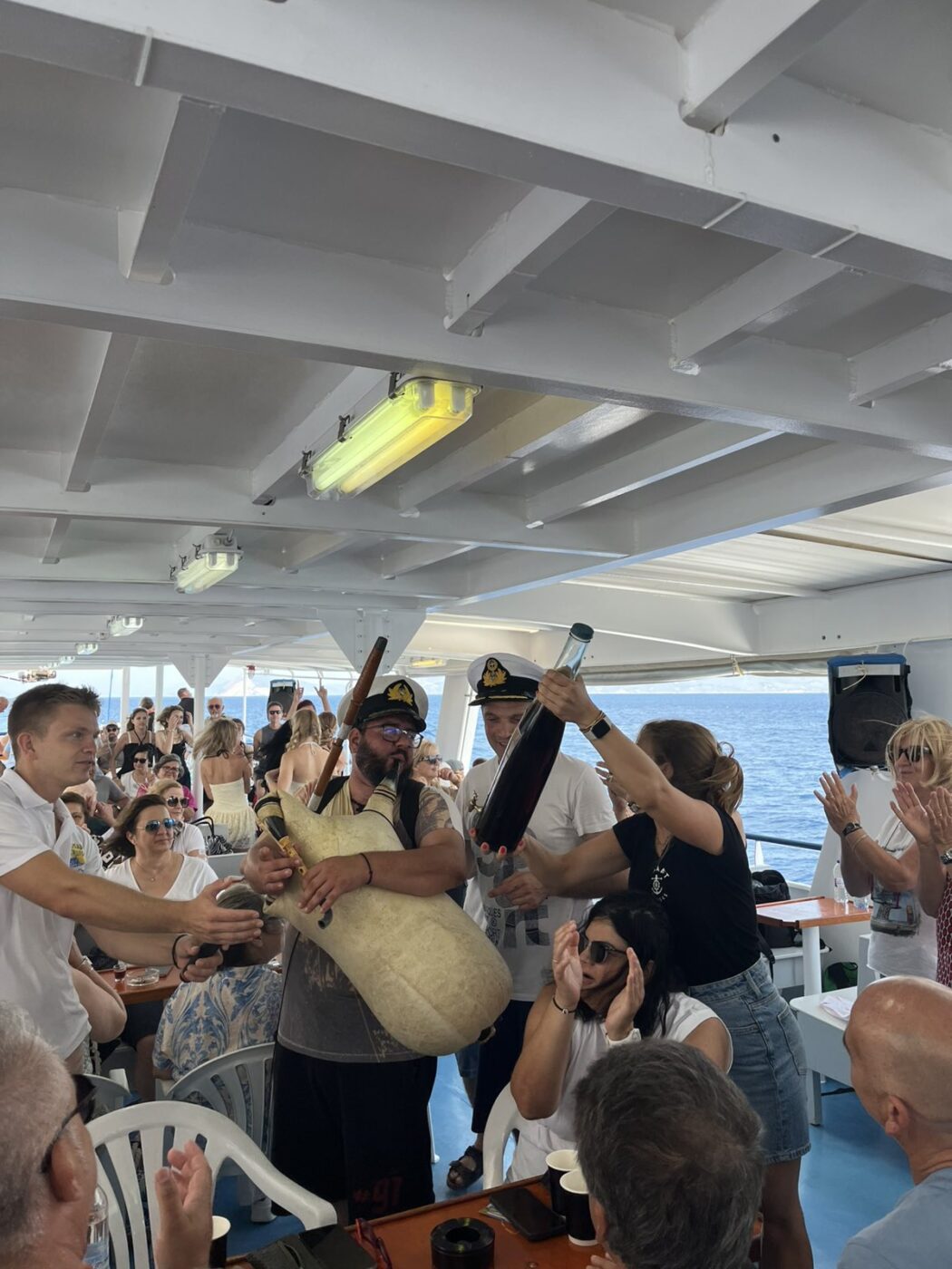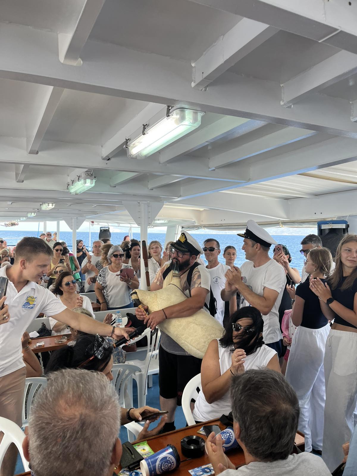 Όπως πάντα τα Τσίπουρα, τα παραδοσιακά μεζεδάκια, τα κεφτεδάκια και το γλέντι είχαν την τιμητική τους στην κρουαζιέρα, ξεσηκώνοντας τους τουρίστες με την Γκάιντα μας και τους χορούς μας!!!Το μεσημέρι γευματίσαμε στην πανέμορφη Σκιάθο, επισκεφτήκαμε Το Μουσείο Ναυτικής και Πολιτιστικής Παράδοσης Σκιάθου με τα εξαιρετικά εκθέματα, την Οικία-Μουσείο του Αλέξανδρου Παπαδιαμάντη και πήραμε τον δρόμο της επιστροφής για τον Βόλο, όπου απολαύσαμε το ωραίο Σαββατόβραδο και το όμορφο λιμάνι του Βόλου.