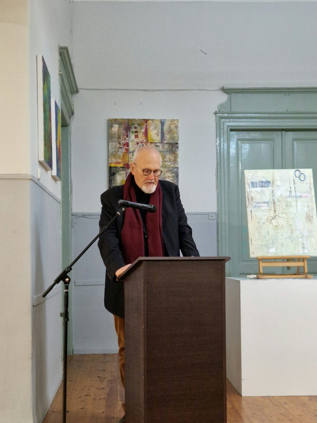 Μετά κάλεσε στο βήμα τον ίδιο τον ζωγράφο, ο οποίος, φανερά συγκινημένος, μίλησε για την αγάπη του για την ζωγραφική και την πορεία του, όπου ξεκινώντας από την παραστατική ζωγραφική έφτασε στο μοντερνισμό. «Ο κύριος στόχος μου είναι η σύνθεση των χρωμάτων», είπε μεταξύ άλλων. «Ξέρετε τι θα σήμαινε για τον κόσμο μας αν βλέπαμε μόνο μαύρο και άσπρο; Αυτό που θα συνέβαινε είναι ότι θα είχαμε έναν κόσμο γεμάτο κατάθλιψη» και αργότερα «Τα χρώματα θα μας βοηθήσουν να δημιουργήσουμε μια ζωή που αξίζει να τη ζούμε».