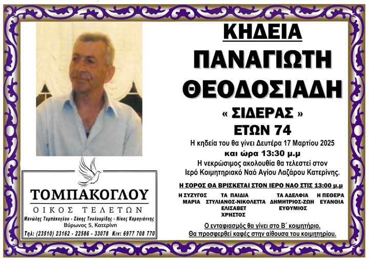 Σε ηλικία 74 ετών απεβίωσε ο σιδεράς Παναγιώτης Θεοδοσιάδης, σκορπώντας τη θλίψη σε συγγενείς, γνωστούς και φίλους. Η κηδεία του θα γίνει αύριο, Δευτέρα 17 Μαρτίου και ώρα 13:30 μ.μ. Η νεκρώσιμος ακολουθία θα τελεστεί στον Ιερό Ναό Αγίου Λαζάρου.