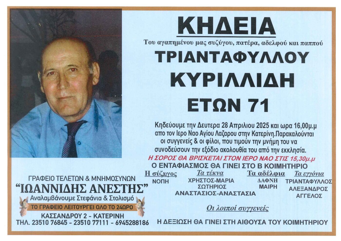 Σε ηλικία 71 ετών απεβίωσε ο Τριαντάφυλλος Κυριλλίδης, βυθίζοντας στο πένθος την οικογένεια του. Η κηδεία του θα γίνει αύριο, Δευτέρα 28 Απριλίου και ώρα 16:00 μ.μ. Η νεκρώσιμος ακολουθία θα τελεστεί στον Ιερό Ναό Αγίου Λαζάρου Κατερίνης, ενώ η ταφή θα γίνει στο Β’ κοιμητήριο.