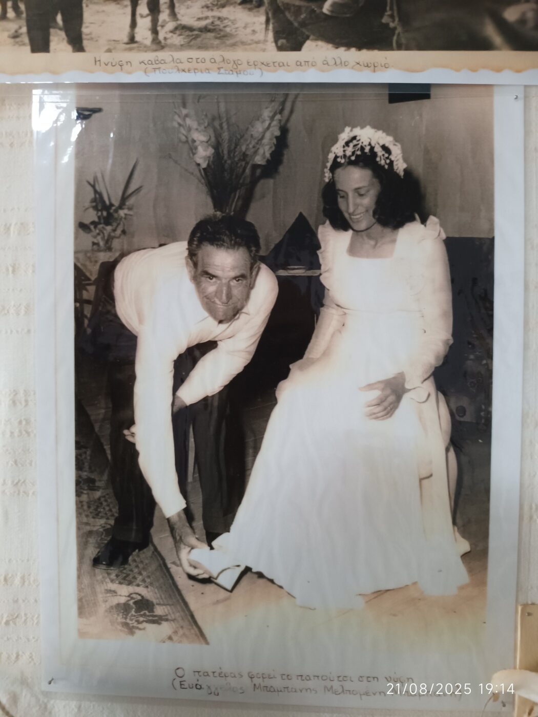 Πριν φύγουν για την εκκλησία, ο πατέρας της έκανε μια κίνηση που συγκινούσε πάντα: έπαιρνε το νυφιάτικο παπούτσι και το φορούσε στο πόδι της κόρης του. Ήταν σαν να της έδινε την ευχή του· να πατήσει γερά στο νέο της σπιτικό, με υγεία και καλοτυχία.