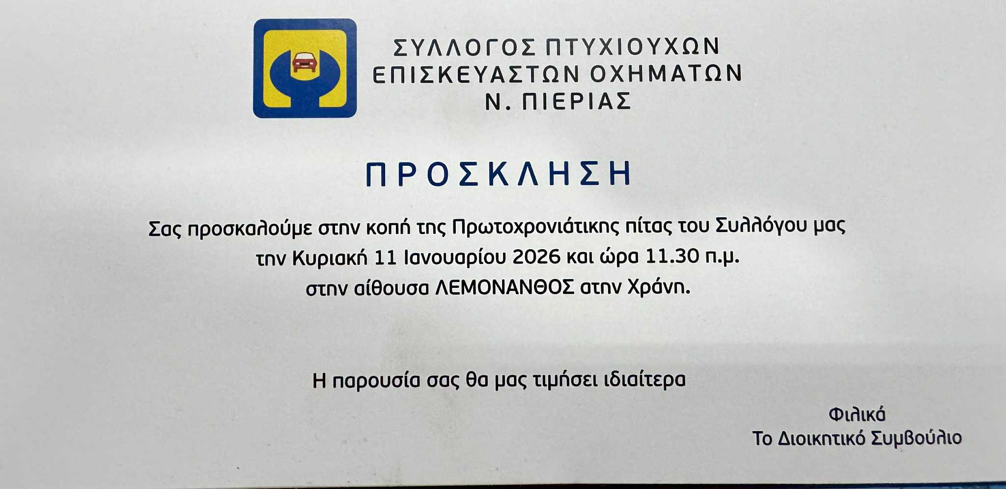 Ο Σύλλογος Πτυχιούχων Επισκευαστών Οχημάτων Νομού Πιερίας προσκαλεί τα μέλη του, τους συνεργάτες και τους φίλους του στην καθιερωμένη εκδήλωση κοπής της Πρωτοχρονιάτικης πίτας, που θα πραγματοποιηθεί την Κυριακή 11 Ιανουαρίου 2026 και ώρα 11:30 π.μ., στην αίθουσα Λεμονανθός στην Χράνη.