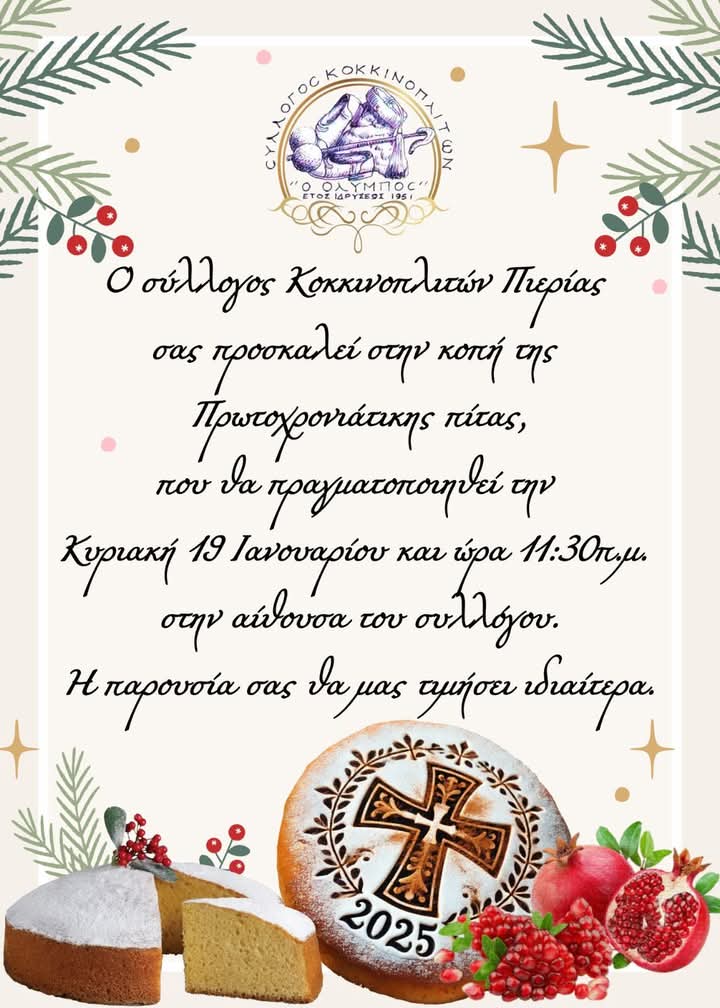 Με ιδιαίτερη χαρά και τιμή σας προσκαλούμε στην κοπή της Πρωτοχρονιάτικης πίτας του Συλλόγου μας που θα πραγματοποιηθεί την Κυριακή 19 Ιανουαρίου 2025 και ώρα 11.30π.μ. στην Πολιτιστική μας Στέγη, επί της οδού Νίκης 12 στην Κατερίνη Πιερίας.