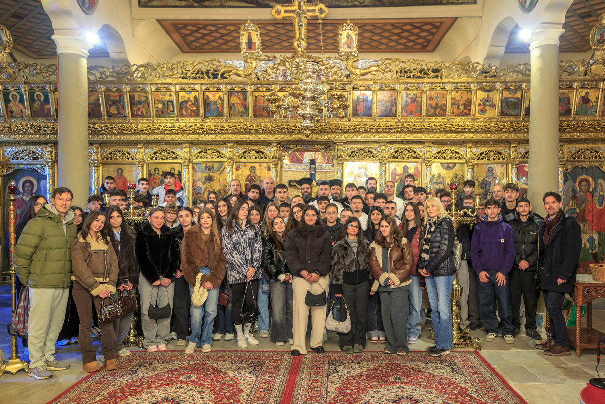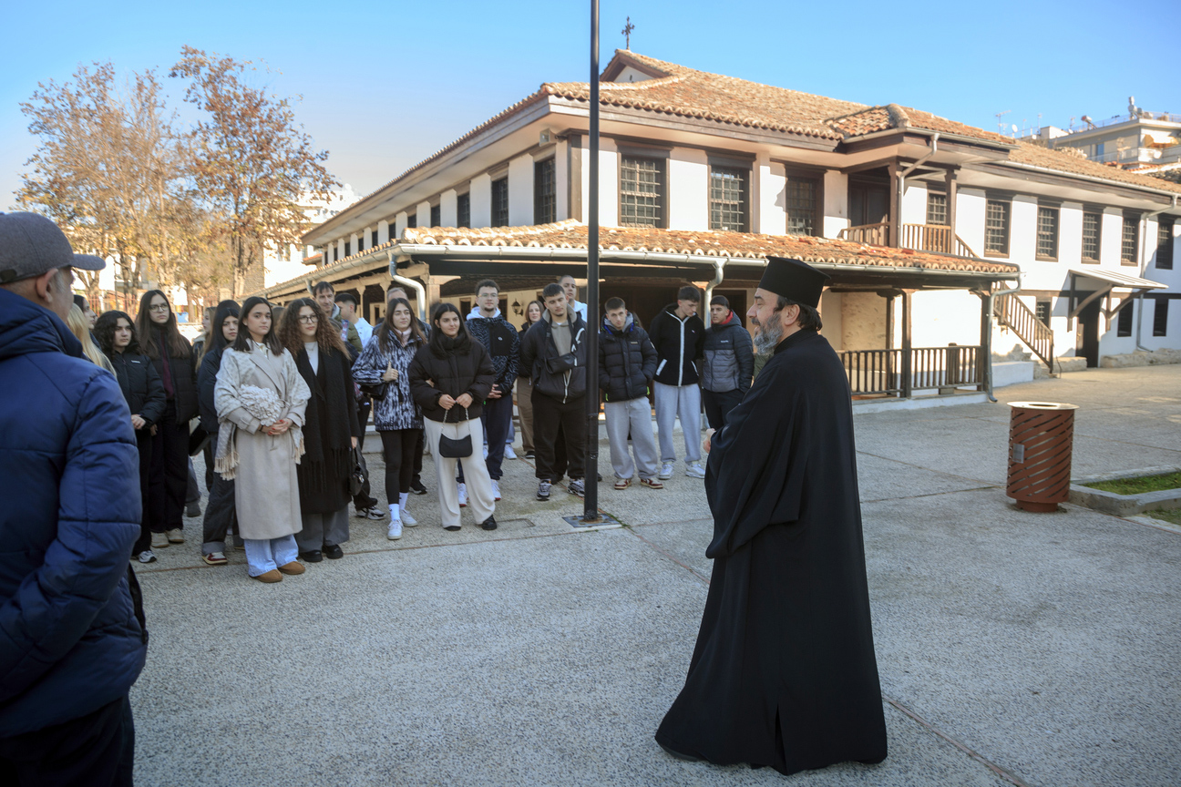 Στη συνέχεια, επισκέφθηκαν τον Ναό Κοιμήσεως της Παναγίας, ο οποίος αποκαταστάθηκε προσφάτως στο αρχικό του κάλλος με προσωπική επιμέλεια του οικείου Μητροπολίτη. Ο Σεβασμιότατος υποδέχτηκε τους μαθητές στον χώρο και, αφού μίλησε για την ιστορία του ναού, αναφέρθηκε εκτενώς στις κοινωνικές, δημογραφικές, οικονομικές και γεωπολιτικές προκλήσεις που αντιμετωπίζει η Θράκη. Τόνισε ότι η Εκκλησία, στο πλαίσιο του φιλανθρωπικού της έργου, δεν διακρίνει τους πολίτες με βάση το θρήσκευμά τους και υπογράμμισε τον ρόλο των θρησκευτικών λειτουργών στην αρμονική συμβίωση των πολιτών. Παράλληλα, σημείωσε ότι ο φιλανθρωπικός και κοινωνικός ρόλος της Εκκλησίας αποτελεί το δεύτερο σκέλος της αποστολής της, καθώς η κύρια διακονία της είναι ο αγιασμός των πιστών. Τέλος, εξήρε τη σημειολογία της απόφασης των καθηγητών και των μαθητών να πραγματοποιήσουν την εκδρομή τους στη Θράκη και ευχήθηκε οι συμμετέχοντες μαθητές να βρεθούν από τον επόμενο Σεπτέμβριο και πάλι στην περιοχή ως φοιτητές του Δημοκριτείου Πανεπιστημίου Θράκης, το οποίο αποτελεί βασικό πυλώνα ανάπτυξης και ανανέωσης για τον τόπο.