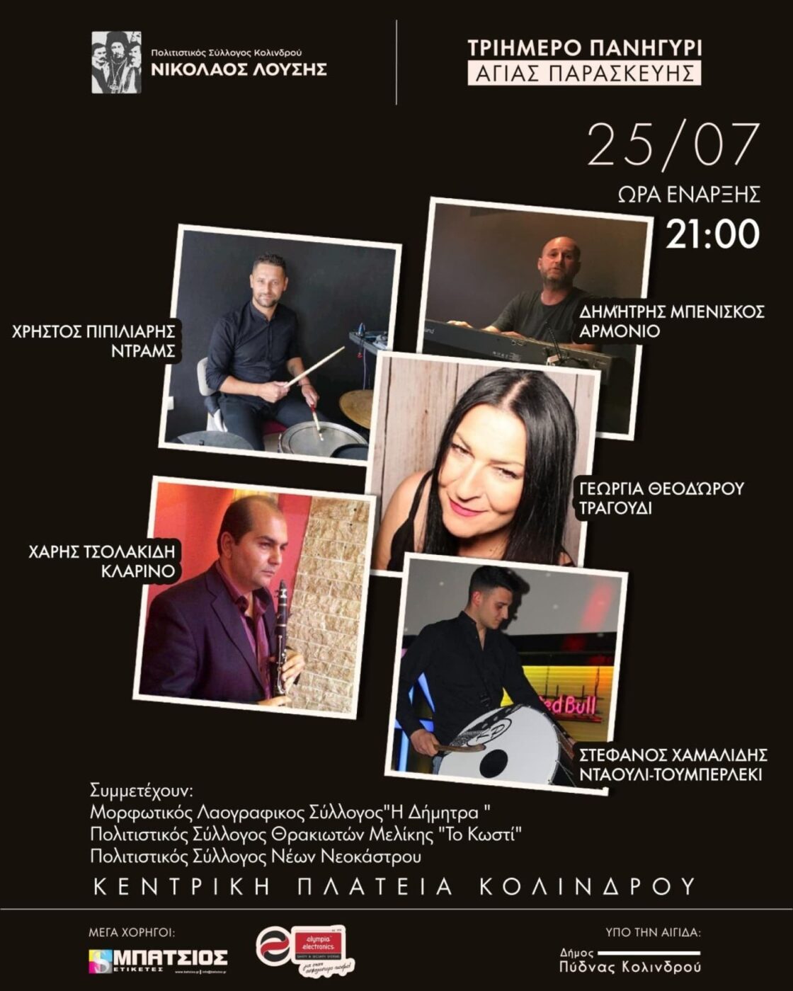 Η πρώτη ημέρα του πανηγυριού που διοργάνωσε ο Πολιτιστικός Σύλλογος Κολινδρού «Νικόλαος Λούσης» στέφθηκε με απόλυτη επιτυχία, συγκεντρώνοντας πλήθος κόσμου στην κεντρική πλατεία του Κολινδρού. Το γλέντι ξεκίνησε στις 21:00 με έντονο κέφι, χορό και παραδοσιακή μουσική από καταξιωμένους καλλιτέχνες: