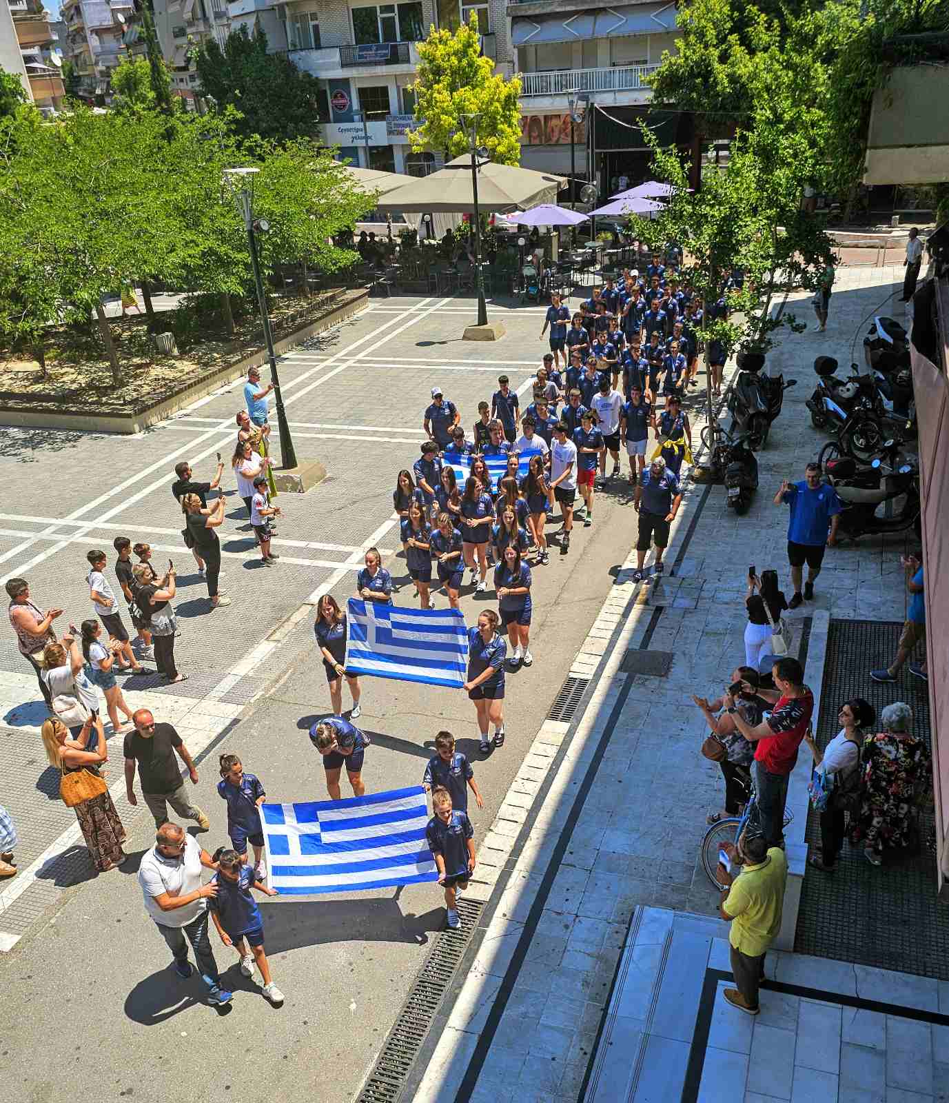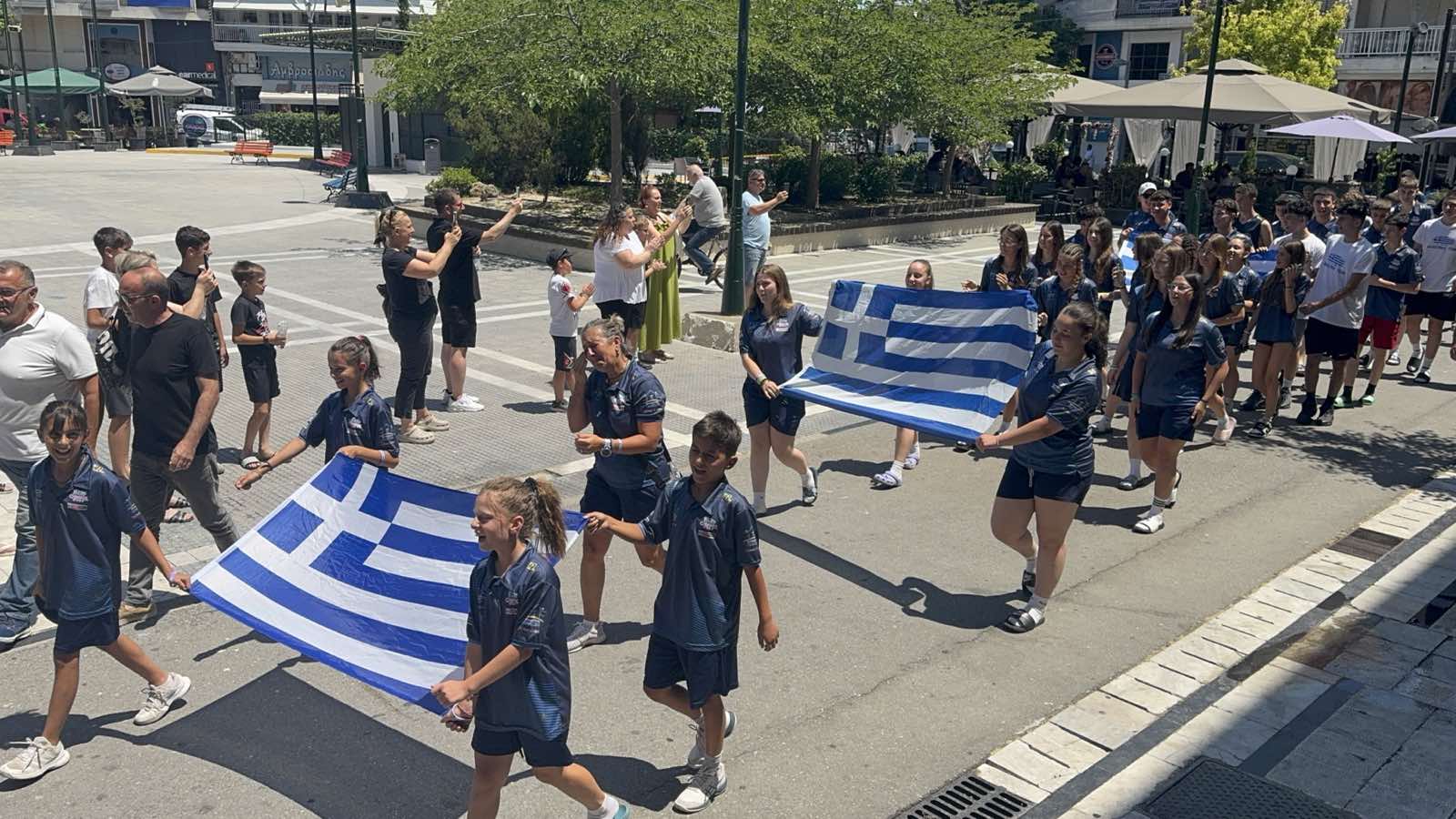 Η υποδοχή που τους επεφύλαξε η Κατερίνη ήταν κάτι παραπάνω από θερμή. Φίλοι, συγγενείς και πολίτες συνόδευσαν την αποστολή από την οδό Ηφαίστου έως την πλατεία Δημαρχείου, δημιουργώντας μια εορταστική πομπή γεμάτη χειροκροτήματα, ελληνικές σημαίες, συνθήματα για τα «χρυσά παιδιά» της πόλης.
