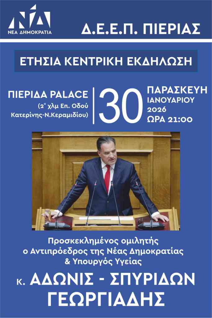 Ο αντιπρόεδρος της Ν.Δ. και υπουργός Υγείας Άδωνις Γεωργιάδης, θα είναι ομιλητής στην ετήσια συνεστίαση της ΔΕΕΕΠ Πιερίας της Νέας Δημοκρατίας.