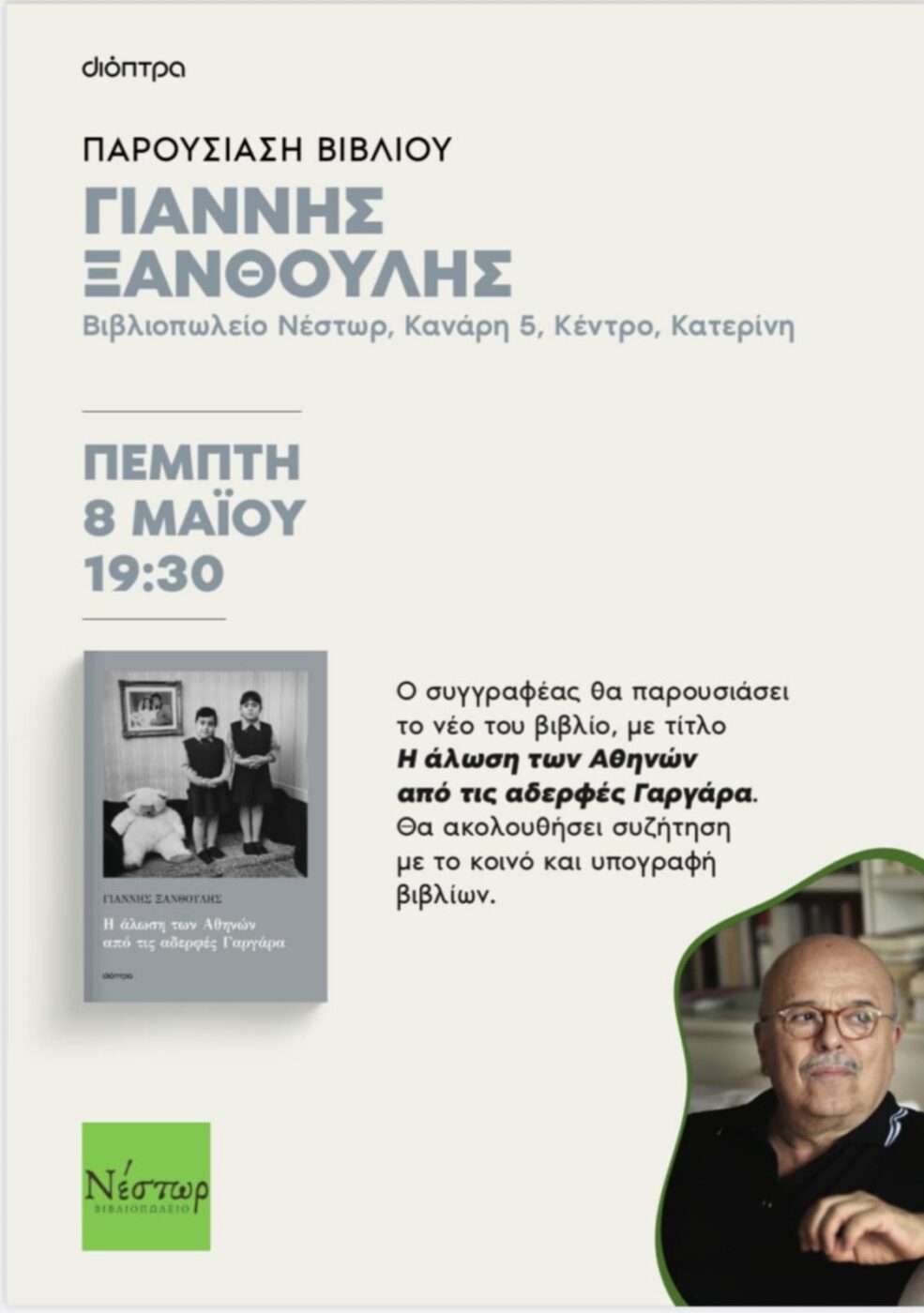 Το βιβλιοπωλείο ΝΕΣΤΩΡ (Κανάρη 5, Κατερίνη) φιλοξενεί την παρουσίαση του νέου βιβλίου του αγαπημένου συγγραφέα Γιάννη Ξανθούλη με τίτλο «Η Άλωση των Αθηνών από τις αδελφές Γαργάρα».