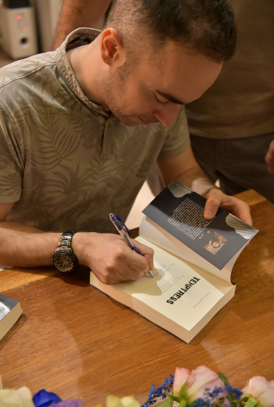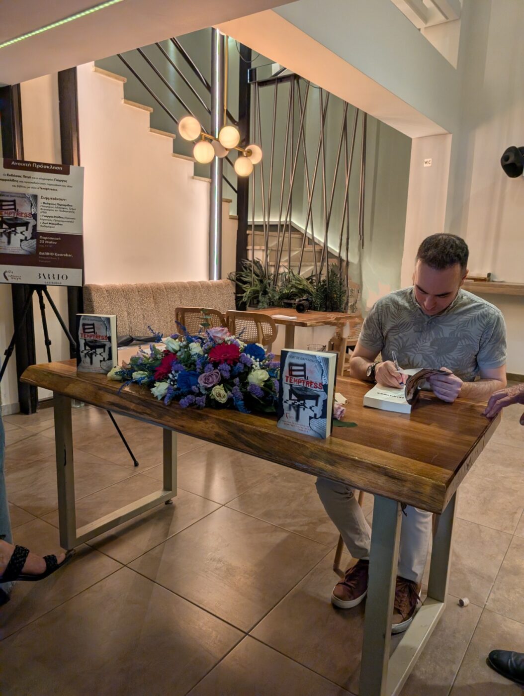 Με την ολοκλήρωση της δικής του ομιλίας σχετικα με τη συγγραφή και την έμπνευση γύρω απο το έργο, μεταξύ άλλων, ο συγγραφέας υπέγραψε και αντίτυπα των βιβλίων”.