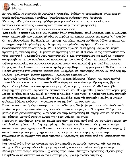 Μια σπάνια δημόσια παρέμβαση πραγματοποίησε ο πρώην Νομάρχης Πιερίας, Γιώργος Παπαστεργίου, σχετικά με την πρόσφατη παραχώρηση των εγκαταστάσεων του πρώην Ψυχιατρικού Νοσοκομείου Πέτρας, από το Υπουργείο Υγείας στην Μητρόπολη Κίτρους, Κατερίνης και Πλαταμώνος.