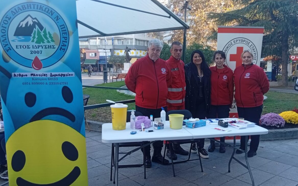 Ο Σύλλογος Διαβητικών Νομού Πιερίας, στο πλαίσιο της Παγκόσμιας Ημέρας κατά του Σακχαρώδη Διαβήτη, πραγματοποίησε την 15η Νοεμβρίου 2025, από τις 8:00 έως τις 12:00, δωρεάν μετρήσεις σακχάρου αίματος στην Πλατεία Ελευθερίας Κατερίνης, με ιδιαίτερα μεγάλη συμμετοχή πολιτών.