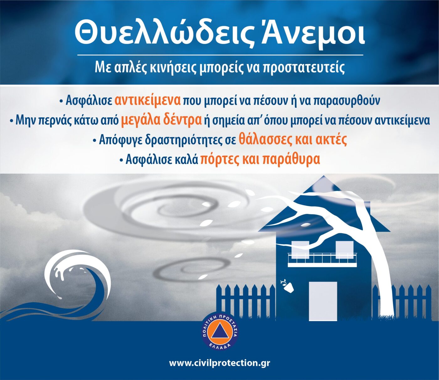 Για περισσότερες πληροφορίες και οδηγίες αυτοπροστασίας από τα έντονα καιρικά φαινόμενα, οι πολίτες μπορούν να επισκεφθούν την ιστοσελίδα του Υπουργείου Κλιματικής Κρίσης και Πολιτικής Προστασίας στην ηλεκτρονική διεύθυνση civilprotection.gov.gr.