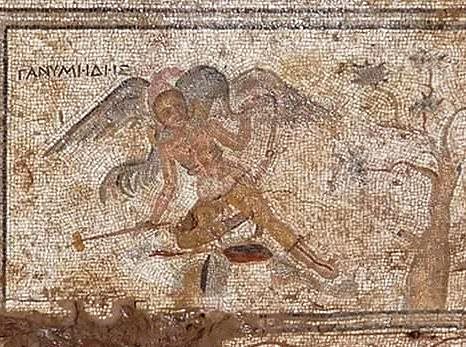 Στην άλλη σκηνή, ο μύθος του Δία και η απαγωγή του έφηβου Γανυμήδη, έχει επίσης διαστρεβλωθεί, και δείχνει τον Δία, όχι με την μορφή αετού, αλλά σαν ένας ερωδιός που κρατά ένα σφουγγάρι και καθαρίζει τα γεννητικά όργανα του Γανυμήδη.