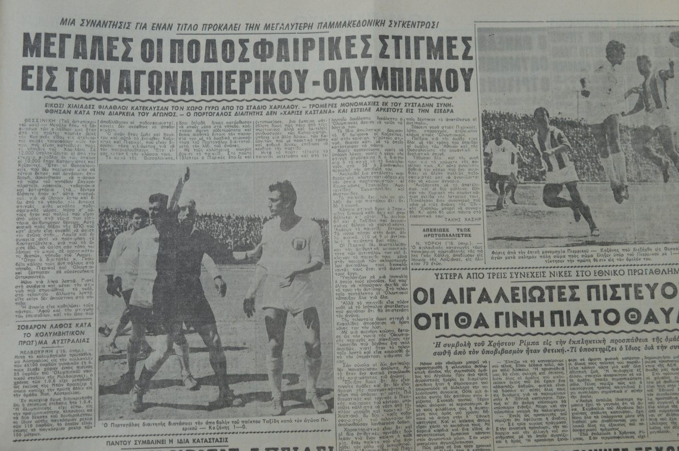Στο συγκεκριμένο δημοσίευμα ο δημοσιογράφος Τάκης Χασήρ σχολιάζει τα παραλειπόμενα της σημαντικής συνάντησης Πιερικού-Ολυμπιακού Κοζάνης που διεξήχθη στο Χαριλάου παρουσία είκοσι χιλιάδων θεατών στην πλειοψηφία Πιεριείς, με έμφαση στις έντονες αντιπαραθέσεις, παθιασμένες διεκδικήσεις, μικροδιαπληκτισμούς που οδήγησαν τον διαιτητή στο να αποβάλλει τρεις ποδοσφαιριστές (δύο Κοζάνης-ένας Πιερικού, ο Αλέκος Ταξίδης).
