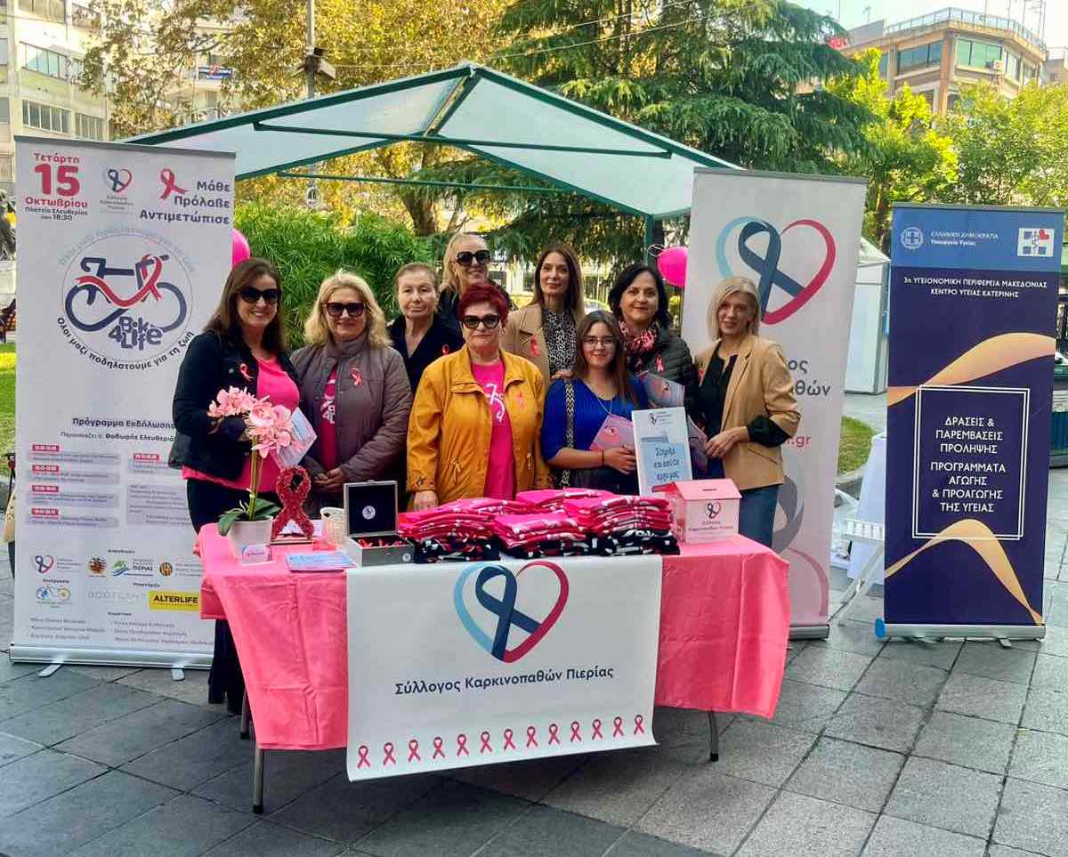 Στο πλαίσιο του Οκτώβρη, μήνα πρόληψης, ενημέρωσης και ευαισθητοποίησης για τον καρκίνο του μαστού, ο Σύλλογος Καρκινοπαθών Πιερίας διοργάνωσε μία εκτεταμένη εκστρατεία ενημέρωσης και ευαισθητοποίησης, σε συνεργασία με την Ιερά Μητρόπολη Κατερίνης, Κίτρους και Πλαταμώνος, την Περιφερειακή Ενότητα Πιερίας και τον Δήμο Κατερίνης και με την υποστήριξη του Κέντρου Υγείας Κατερίνης, της 4ης και 12ης ΤΟΜΥ.