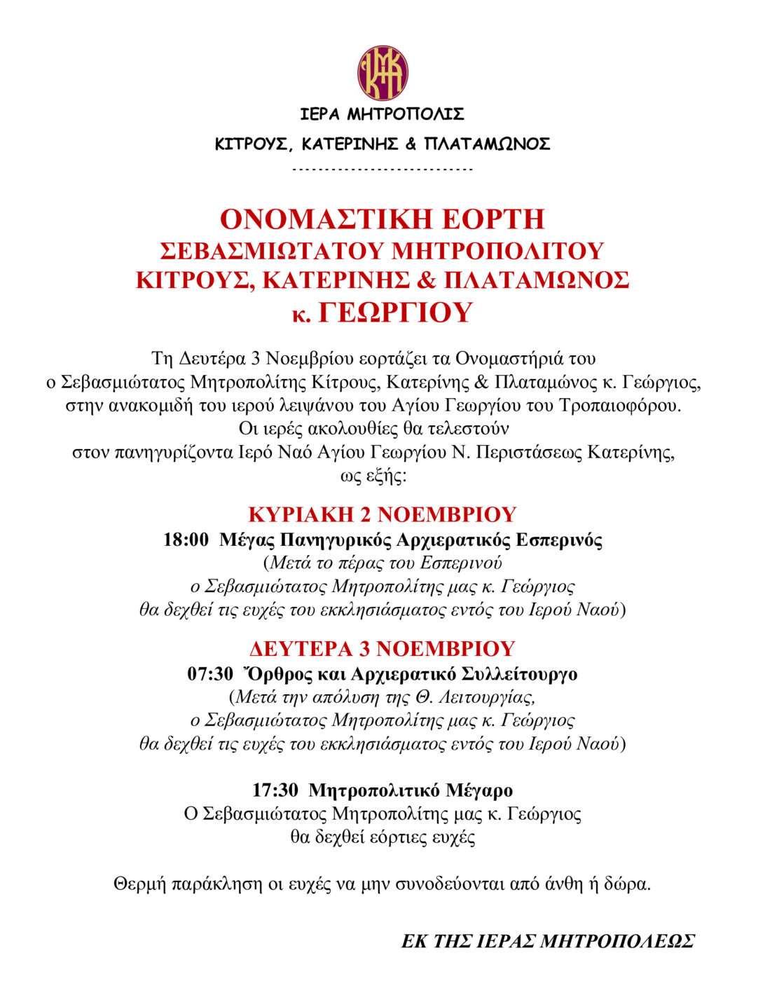 Ονομαστική Εορτή Σεβασμιώτατου Μητροπολίτη Κίτρους, Κατερίνης και Πλαταμώνος κ. Γεώργιου