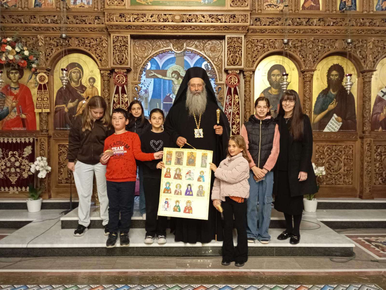 Μια ιδιαίτερη έκπληξη επιφύλαξαν στον Σεβασμιώτατο κ. Γεώργιο η κατηχήτρια και μέλη της Κατηχητικής Σύναξης της Ενορίας, καθώς του δώρισαν μια χειροποίητη κατασκευή εικόνων, που προετοίμασαν ειδικά για τα ονομαστήριά του.