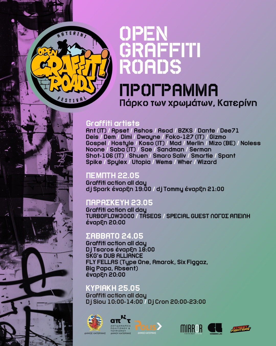 Παράλληλα, θα λειτουργεί η έκθεση graffiti στο Πνευματικό Κέντρο Δήμου Κατερίνης (Α’ όροφος – αίθουσα τέχνης), με εγκαίνια την Παρασκευή 23/5, συνοδευόμενη από προβολή ντοκιμαντέρ για την ιστορία των hip-hop & graffiti.