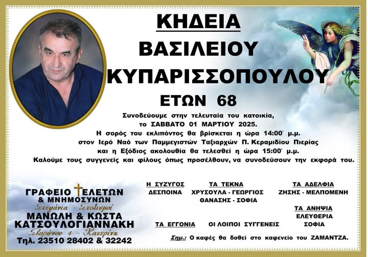 Θλίψη σκόρπισε σε συγγενείς, γνωστούς και φίλους η είδηση της απώλειας του Βασίλη Κυπαρισσοπουλου, σε ηλικία 68 ετών. Η κηδεία του θα γίνει σήμερα, Σάββατο 1 Μαρτίου και ώρα 3:00 το μεσημέρι. Η νεκρώσιμος ακολουθία θα τελεστεί στον Ιερό Ναό Παμμεγίστων Ταξιαρχών Παλαιού Κεραμιδίου.