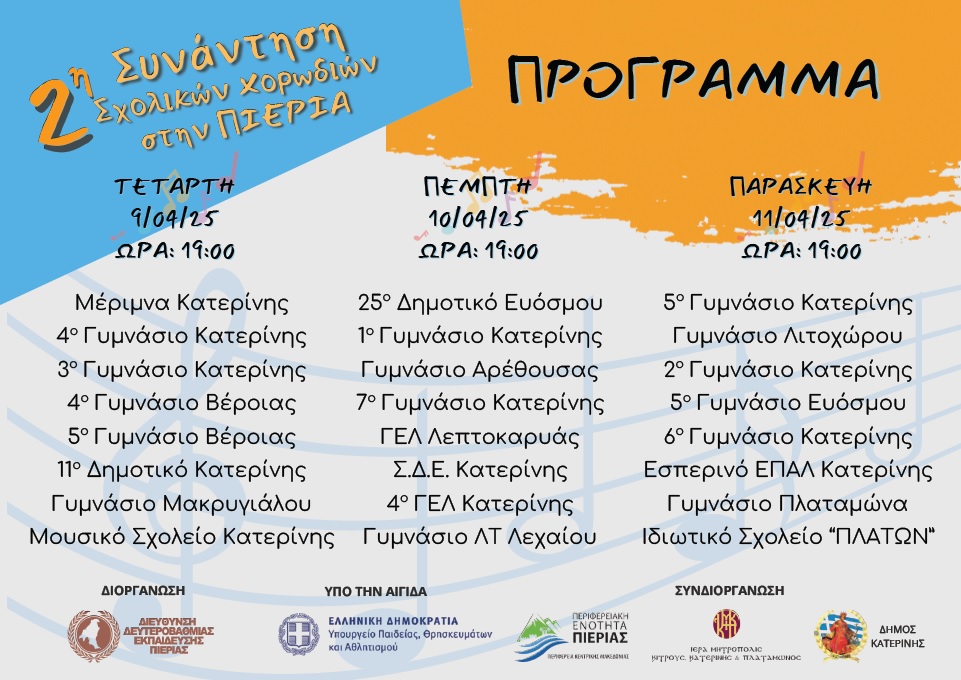 Στην ανοιχτή πρόσκληση που απευθύνει, η Διεύθυνση Δευτεροβάθμιας Εκπαίδευσης του Νομού Πιερίας, τονίζει ότι οι εκδηλώσεις Χορωδίας, θα πραγματοποιηθούν με τη συμμετοχή 25 σχολικών χορωδιών από όλη την Ελλάδα, στο Συνεδριακό Κέντρο Κατερίνης.