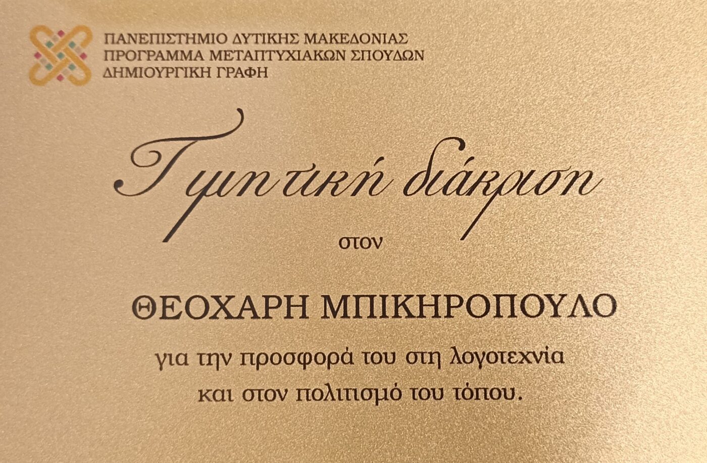 >Κατά την ολοκλήρωση της εκδήλωσης απονεμήθηκε στον συμπολίτη μας πλακέτα «Τιμητικής διάκρισης για την προσφορά του στη λογοτεχνία και τον πολιτισμό του τόπου».
