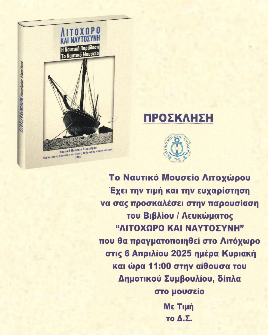 Το Ναυτικό Μουσείο Λιτοχώρου έχει την τιμή και την ευχαρίστηση να σας προσκαλέσει στην παρουσίαση του Βιβλίου – Λευκώματος “Λιτόχωρο και Ναυτοσύνη”, που θα πραγματοποιηθεί στο Λιτόχωρο την Κυριακή 6 Απριλίου 2025 (ώρα 11:00), στην αίθουσα συνεδριάσεων του Δημοτικού Συμβουλίου Δήμου Δίου-Ολύμπου στο Λιτόχωρο (αίθουσα δίπλα στο Ναυτικό Μουσείο Λιτοχώρου).