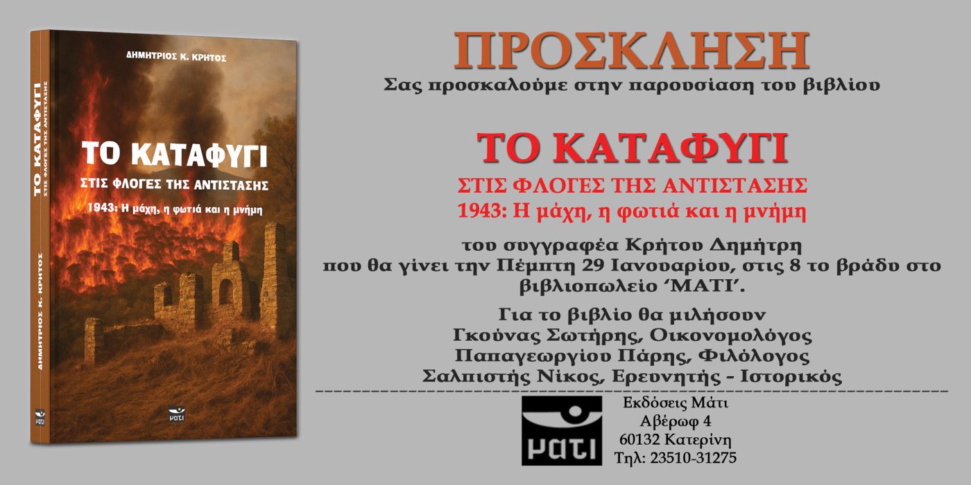 Το βιβλιοπωλείο Μάτι στην Κατερίνη προσκαλεί το κοινό στην παρουσίαση του ιστορικού βιβλίου του Δημήτρη Κρήτου. Το έργο αναφέρεται στην πυρπόληση και στα γεγονότα που προηγήθηκαν, του Καταφυγίου το 1943.