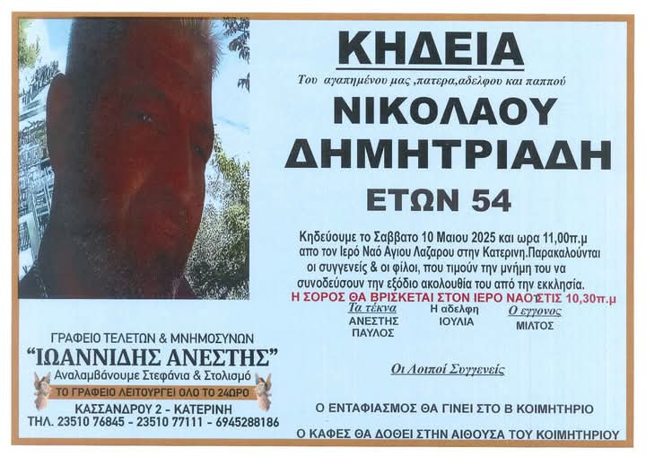 Απεβίωσε σε ηλικία 54 ετών ο Νικόλαος Δημητριάδης, σκορπώντας τη θλίψη σε συγγενείς, γνωστούς και φίλους. Η κηδεία του θα γίνει το Σάββατο 10 Μαϊου και ώρα 11 π.μ. Η νεκρώσιμος ακολουθία θα τελεστεί στον Ιερό Ναό Αγίου Λαζάρου Κατερίνης.