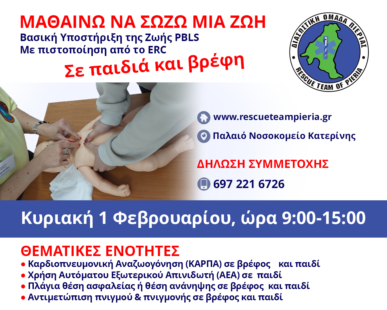 Το πρώτο, στις 25 Ιανουαρίου ημέρα Κυριακή και αφορά την Βασικής Υποστήριξης της Ζωής σε Ενήλικες BLS (Basic Life Support) και το δεύτερο στις 1 Φεβρουαρίου, ημέρα Κυριακή και αφορά την Βασική Υποστήριξη Ζωής σε Παιδιά και Βρέφη (Paediatric Basic Life Support – PBLS).