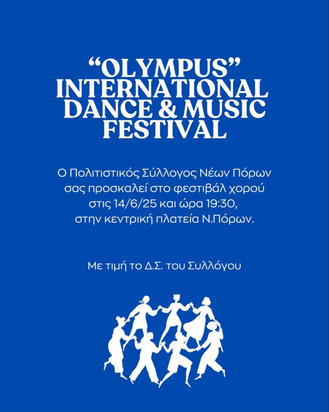 Ο Πολιτιστικός Σύλλογος Νέων Πόρων σας προσκαλεί στο Διεθνές Φεστιβάλ Χορού & Μουσικής, το Σάββατο 14 Ιουνίου 2025 και ώρα 19:30 στην κεντρική πλατεία Νέων Πόρων.