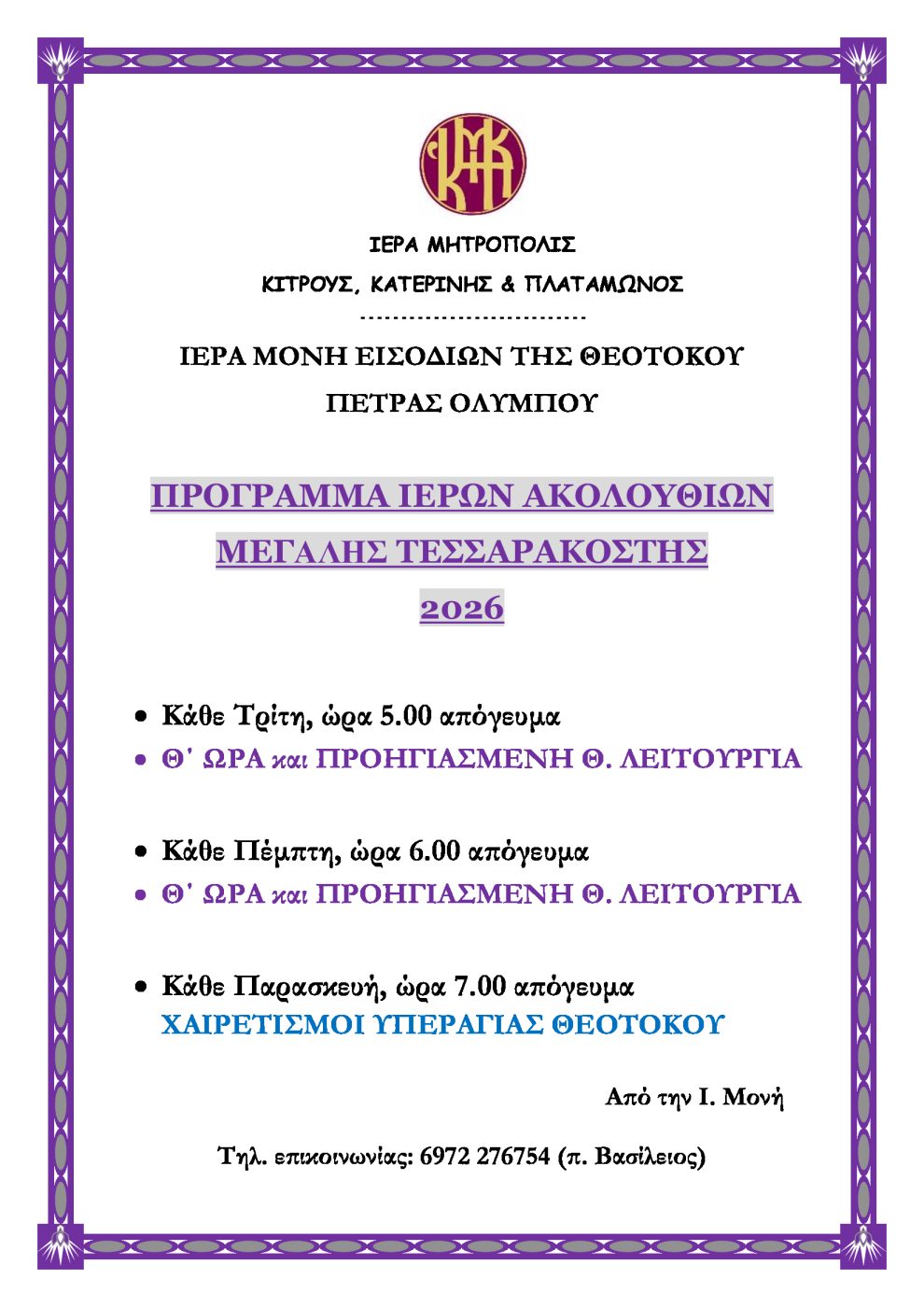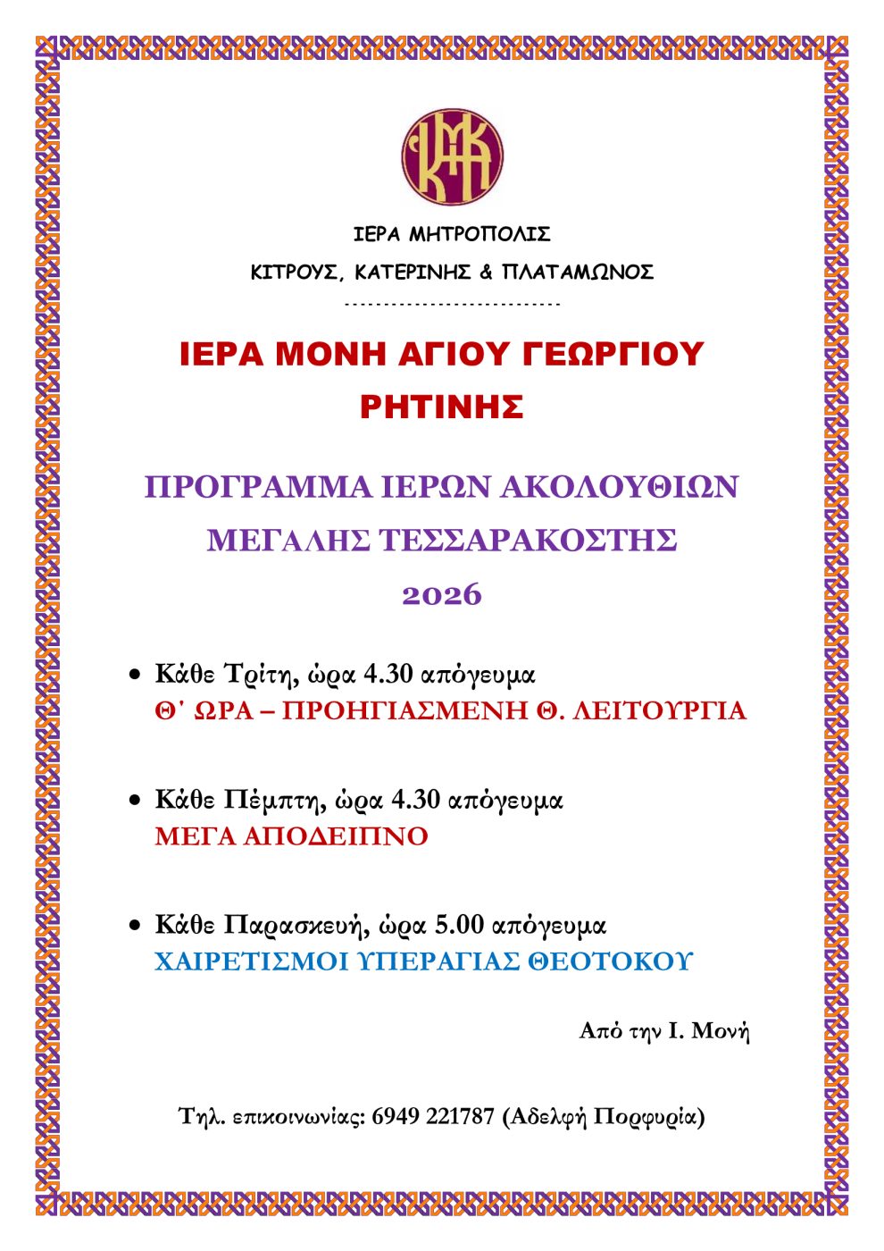 Πρόγραμμα Ακολουθιών Μεγάλης Τεσσαρακοστής στην Ι.Μ. Αγίου Γεωργίου Ρητίνης και στην Ι.Μ. Παναγίας Πέτρας Ολύμπου