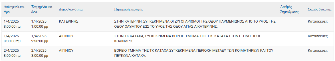 Σύμφωνα με ανακοίνωση της ΔΕΔΔΗΕ Α.Ε., Προγραμματισμένη διακοπή ρεύματος 01/04 και 02/04 στις εξής τοποθεσίες: