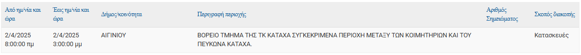 Σύμφωνα με ανακοίνωση της ΔΕΔΔΗΕ Α.Ε., Προγραμματισμένη διακοπή ρεύματος 02/04 στις εξής τοποθεσίες:
