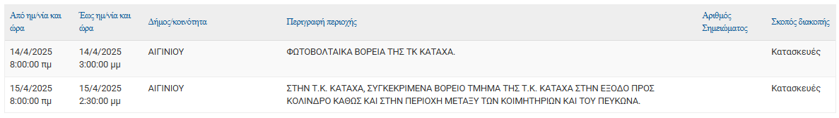 Σύμφωνα με ανακοίνωση της ΔΕΔΔΗΕ Α.Ε., Προγραμματισμένη διακοπή ρεύματος 14/04 και 15/04 στις εξής τοποθεσίες: