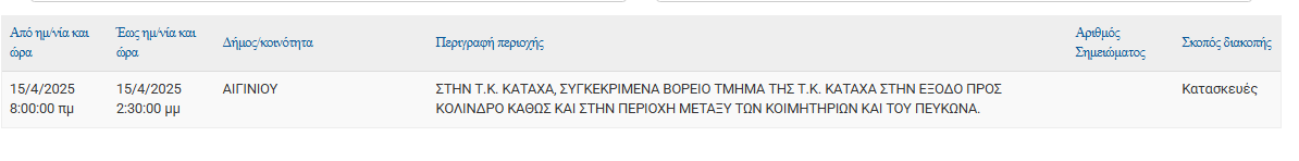 Σύμφωνα με ανακοίνωση της ΔΕΔΔΗΕ Α.Ε., Προγραμματισμένη διακοπή ρεύματος 15/04 στις εξής τοποθεσίες: