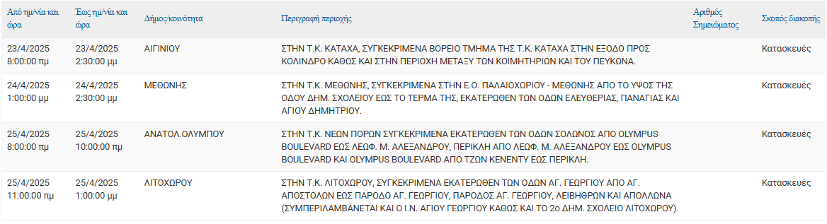 Σύμφωνα με ανακοίνωση της ΔΕΔΔΗΕ Α.Ε., Προγραμματισμένη διακοπή ρεύματος 23/04, 24/04 και 25/04 στις εξής τοποθεσίες: