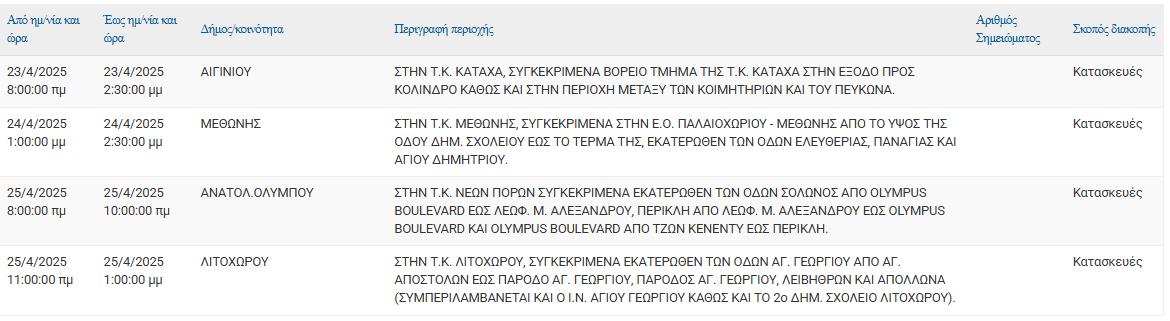 Σύμφωνα με ανακοίνωση της ΔΕΔΔΗΕ Α.Ε., Προγραμματισμένη διακοπή ρεύματος 23/04, 24/04 και 25/04 στις εξής τοποθεσίες: