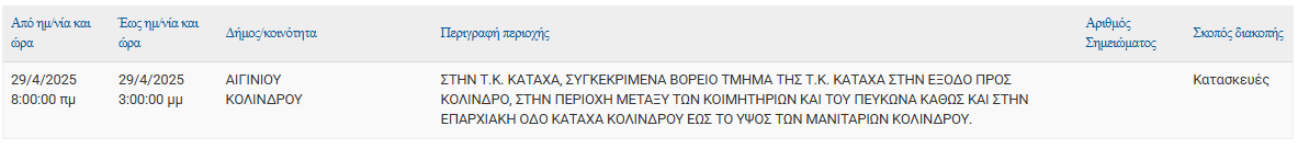 Σύμφωνα με ανακοίνωση της ΔΕΔΔΗΕ Α.Ε., Προγραμματισμένη διακοπή ρεύματος 29/04 στις εξής τοποθεσίες: