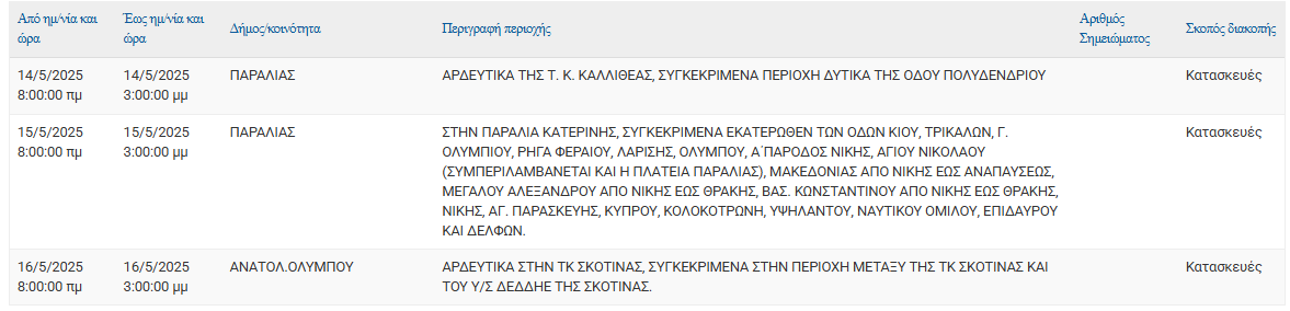 Σύμφωνα με ανακοίνωση της ΔΕΔΔΗΕ Α.Ε., Προγραμματισμένη διακοπή ρεύματος 14/05, 15/05 και 16/05 στις εξής τοποθεσίες:
