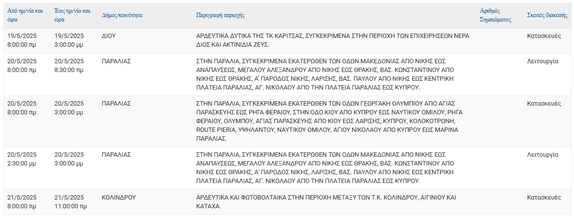 Σύμφωνα με ανακοίνωση της ΔΕΔΔΗΕ Α.Ε., Προγραμματισμένη διακοπή ρεύματος 19/05, 20/05, 21/05, στις εξής τοποθεσίες: