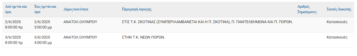 Σύμφωνα με ανακοίνωση της ΔΕΔΔΗΕ Α.Ε., Προγραμματισμένη διακοπή ρεύματος 02/06 και 03/06 στις εξής τοποθεσίες: