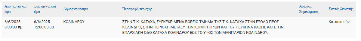 Σύμφωνα με ανακοίνωση της ΔΕΔΔΗΕ Α.Ε., Προγραμματισμένη διακοπή ρεύματος 06/06 στις εξής τοποθεσίες: