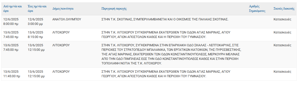 Σύμφωνα με ανακοίνωση της ΔΕΔΔΗΕ Α.Ε., Προγραμματισμένη διακοπή ρεύματος 12/06 και 13/06 στις εξής τοποθεσίες: