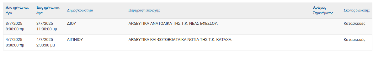 Σύμφωνα με ανακοίνωση της ΔΕΔΔΗΕ Α.Ε., Προγραμματισμένη διακοπή ρεύματος 03/07 και 04/07 στις εξής τοποθεσίες: